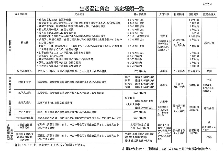 このご案内は生活福祉資金の概要です。詳細は、お住まいの市町社会福祉協議会にお問い合わせください。